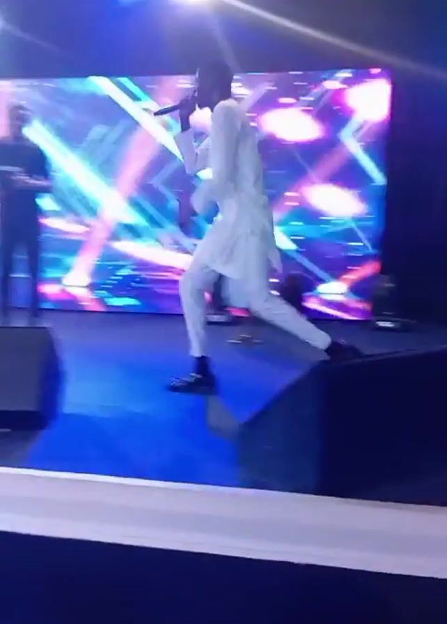 A man in a white suit sings and dances on a stage at what looks to be a church service
