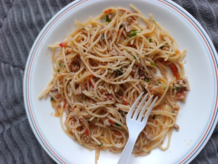 A white, circular ceramic plate with a blue and red rim is positioned on a dark gray, horizontally ribbed textile surface in Kahawa Wendani ward, Kenya. The plate contains a serving of spaghetti coated in a light reddish-brown sauce, mixed with ground meat, diced red vegetables, and green herbs. A white, four-tine plastic fork rests within the spaghetti, angled towards the bottom-left of the plate. No individuals are present in the scene. The lighting is consistent, indicating an indoor setting.