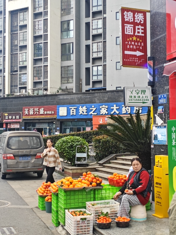 This image depicts a street scene in Bishan, China, characterized by urban commercial and residential structures alongside a street vendor. In the foreground, on the right side of a paved sidewalk, an adult female vendor is seated on a light-colored plastic stool. She wears a red long-sleeved top, a dark vest, and patterned trousers, and holds a small, round orange-colored fruit in her left hand, looking towards the viewer. In front of her and extending to the left are numerous piles of oranges or tangerines displayed for sale. These fruits are contained within several green and white plastic crates, as well as two dark bowls directly on the ground. To the left of the fruit display, another adult female is walking towards the viewer's right. She wears a light-colored, striped collared jacket and dark pants, and carries an object in her left hand. Behind her, a grey minivan with visible dents on its rear bumper is parked on the street. The vehicle displays a license plate number "渝 B 91P56." Mid-ground elements include a raised planter with green hedges and a small palm-like plant, separating the sidewalk from a short flight of stone stairs leading upwards. Behind the planter, a grey utility cart with two wheels is visible. The background features several multi-story buildings. At ground level, various commercial establishments are visible, including "芙蓉兴盛 便利超市" (Furong Xingsheng Convenience Store) with a red sign and "百姓之家大药房" (Baixing Zhi Jia Pharmacy) with a blue sign. Above these storefronts, tall, light-grey residential or mixed-use buildings with multiple windows and balconies, many fitted with security grilles, dominate the skyline. A large vertical red banner sign on the right building features white Chinese characters "锦绣面庄" (Jinxiu Noodle House) and a white arrow pointing right, indicating an entrance. Below this banner, a smaller white sign with a scissors icon advertises "享理" (Enjoy Hairdressing) and provides contact information. A vertical LED barber pole light is mounted on the building wall to the right of the red banner. On the far right, parts of a yellow vertical structure and a green sign with "中国茶" (Chinese Tea) are visible.
