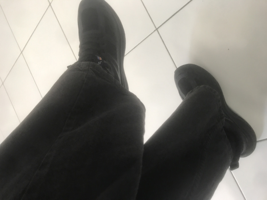 An overhead view captures the lower legs and feet of an individual, seated or standing. The person wears dark, likely black, trousers that are visibly creased, and dark, presumably black, athletic shoes with thick soles. A small, rectangular tag with red, white, and blue elements is visible near the cuff of the right trouser leg, above the shoe. The legs are bent, and the right leg appears to be positioned slightly in front of the left. The footwear rests on a light-colored, reflective floor composed of large, square white tiles with dark grout lines, forming a grid pattern. The environment is uniformly lit, indicating an indoor setting. The specific city of Muka, Indonesia is not visually discernible within the image.
