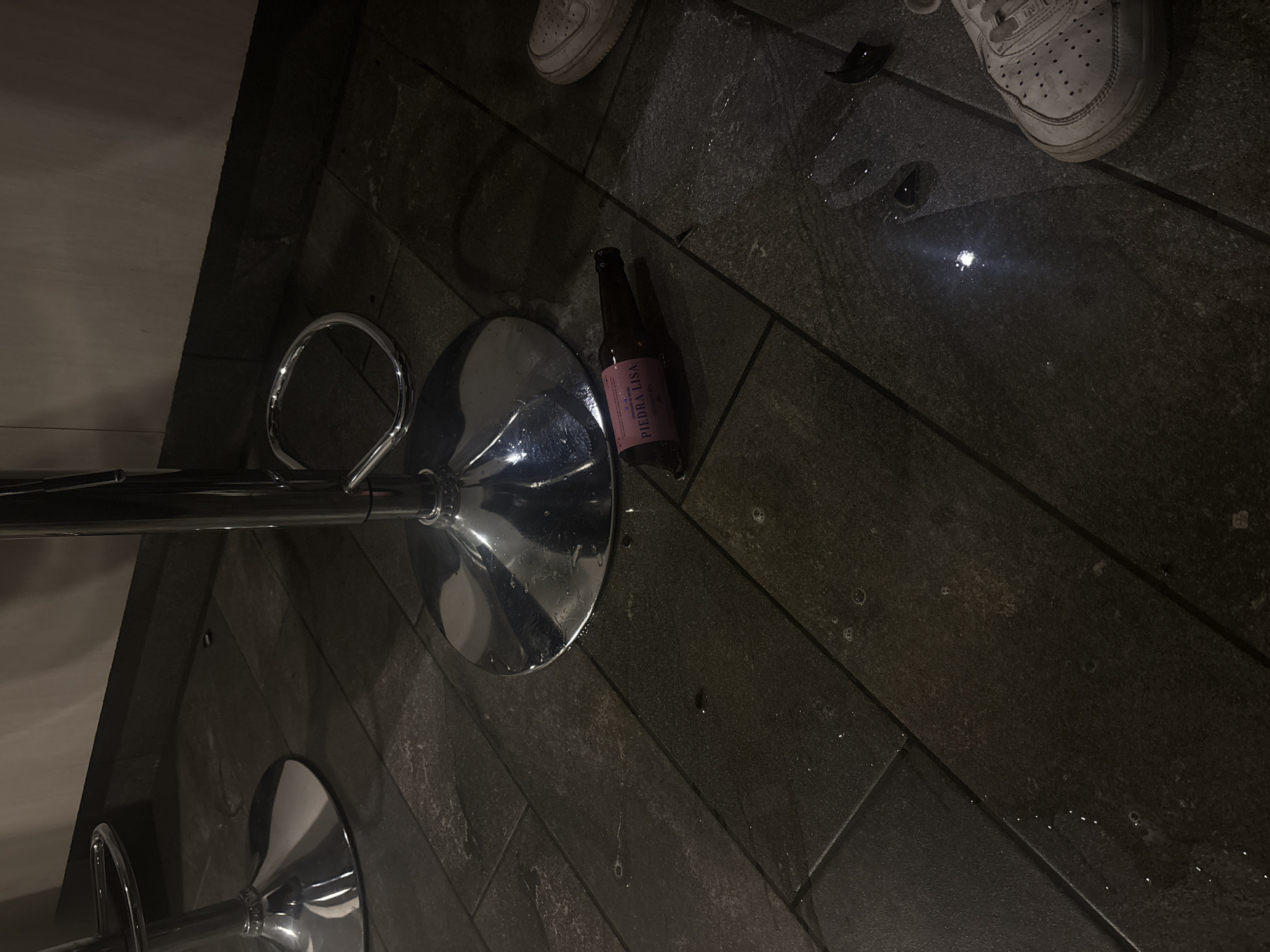 The image depicts an indoor or semi-enclosed area in San Andrés Cholula, Mexico, featuring a dark grey tiled floor and a light-colored wall with a dark baseboard. Two chrome-plated bar stools are present; one is centrally located, showing its reflective circular base, pole, and footrest, while a second stool's base is partially visible in the upper-left corner. A brown glass bottle, bearing a pink label that reads "PIEDRA LISA SESSION IPA," lies horizontally on the floor near the center. The floor around the bottle and extending into the lower-right quadrant is wet with numerous droplets and small puddles of liquid, reflecting light sources. In the lower-right corner, the right foot of an individual is visible, wearing a white sneaker with perforations and a thick sole, characteristic of a Nike Air Force 1 style. Scattered on the wet floor near the bottle and the sneaker are several small, dark, irregular fragments. The scene is dimly lit.