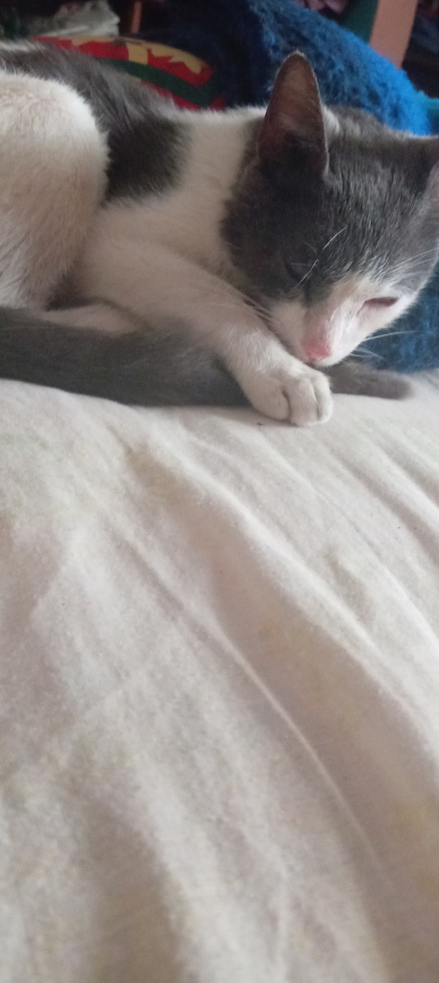- "A gray and white cat is sleeping on a wrinkled, off-white surface that appears to be a bed sheet" by FM-DhFfC2, licensed under CC BY 4.0