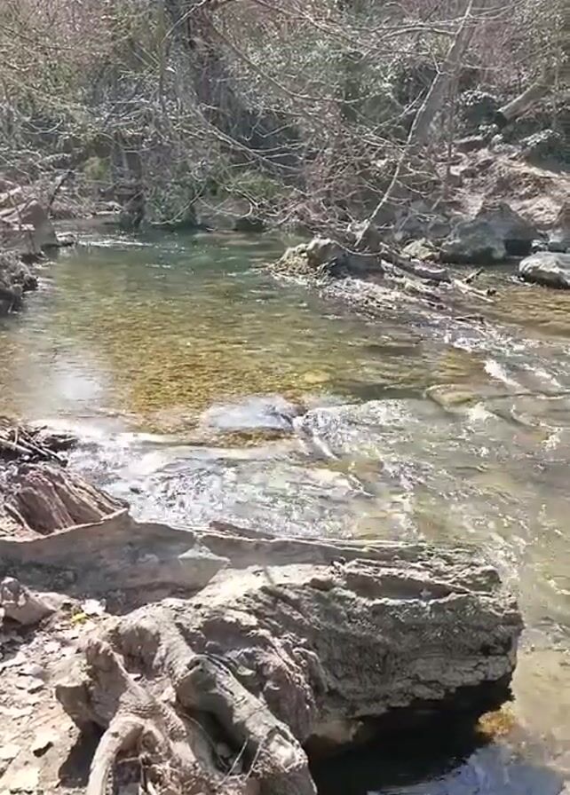 slow-moving stream in a wooded area. The water is clear, with a yellowish tint on the bottom, and flows over rocks and fallen tree branches. There are bare trees on either side of the stream. A large rock sits in the foreground. The scene is sunny.