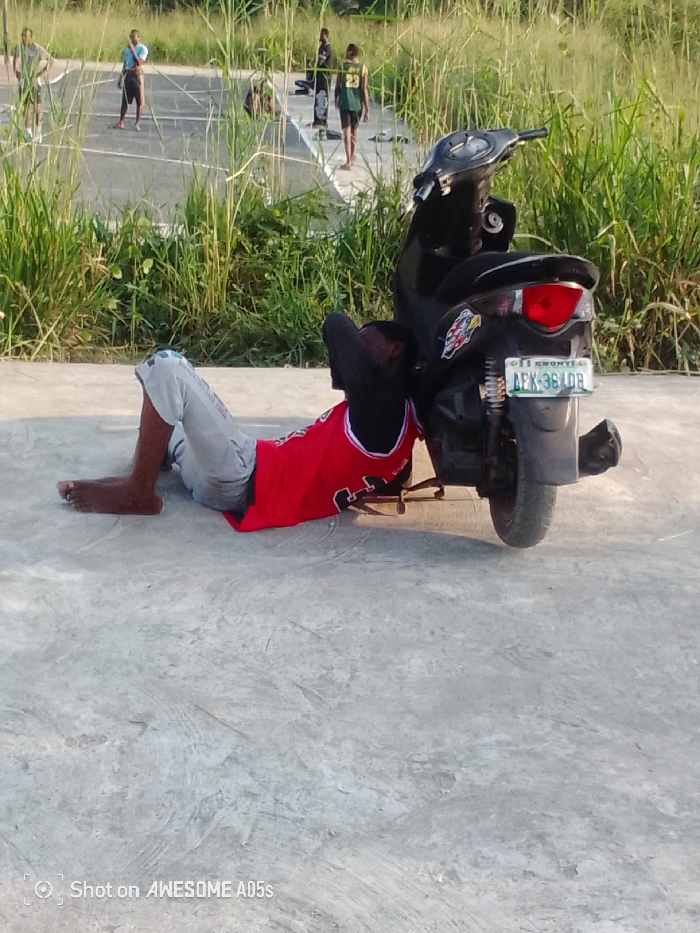 The scene is an outdoor setting in Ifite-Awka, Anambra State, Nigeria, confirmed by the "ANAMBRA AFK-364DB" license plate on a scooter. A barefoot individual, wearing a red number "23" jersey over a black long-sleeved shirt and light gray pants, lies supine on a light gray concrete surface. Their hands are clasped behind their head, resting against the side of a black scooter which is on its kickstand. The scooter's rear faces the viewer, displaying a red taillight and multiple stickers on its side panel. Immediately beyond the concrete is an expanse of tall, green grass and wild vegetation. In the mid-ground, a dirt track traverses this grassy area. On this track, at least five other individuals are visible; one wears a dark green number "23" jersey, while others are casually standing or moving within the open space.
