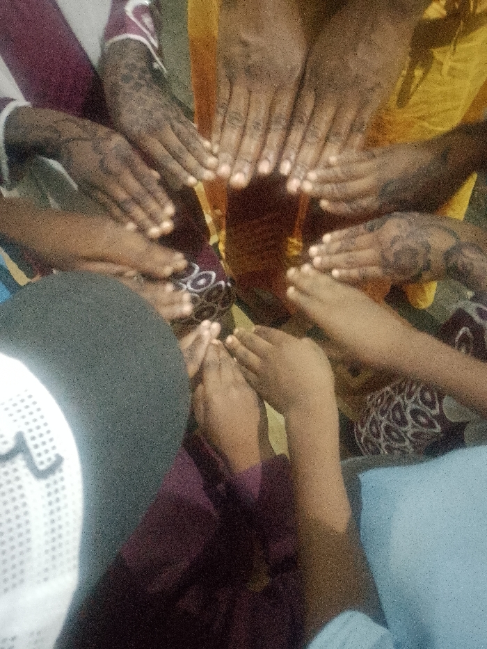 A high-angle forensic shot captures a central cluster of at least seven human hands and forearms belonging to multiple individuals with brown skin tones. The hands are arranged in a loose circular formation, predominantly with palms oriented downwards or slightly cupped, fingers extended. Several hands display intricate dark henna patterns on their dorsal surfaces, particularly around the wrists and backs of the hands. Various garments are visible, including fabric in deep maroon, yellow, and light blue, as well as a patterned textile featuring white concentric circles on a dark background. In the lower-left quadrant, a partial view of a subject's head and shoulder is present, showing a dark, textured cap and a white garment with a distinct pattern. The scene's lighting is moderate, and the overall context suggests a communal gathering or ritual. The location is the city of Unknown, Unknown.