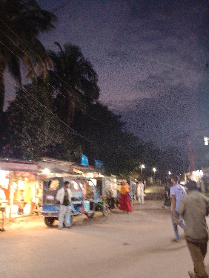 street scene in Bhola, Bangladesh, located at latitude 22.657 and longitude 90.663. The scene is taken at night, with a dusky sky and streetlights illuminating the road. There are several people walking on the street, including a man in a blue shirt walking towards the left, a woman wearing a red and white sari walking in the opposite direction, and a man in a beige shirt walking towards the right. Two men in white shirts are walking towards the right in the distance. The street is lined with shops and street vendors, selling various goods. There are several rickshaws parked on the side of the road. The scene is bustling with activity, with people going about their daily lives in the late evening. The trees in the background are silhouetted against the twilight sky. The image is slightly blurry, but it captures the essence of a typical street scene in Bhola, Bangladesh.