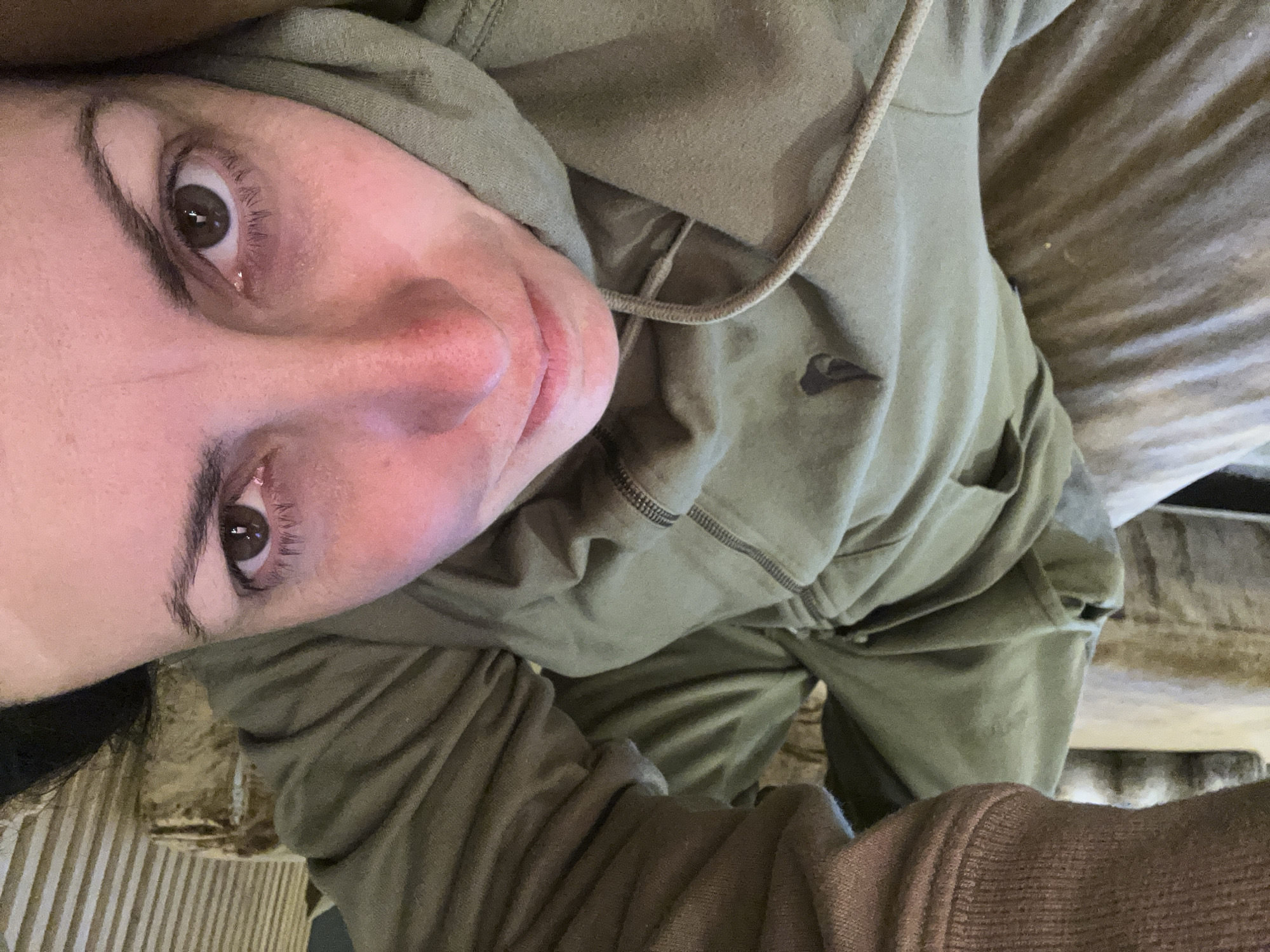 A close-up, tilted selfie of a person wearing a green hooded zip-up sweatshirt