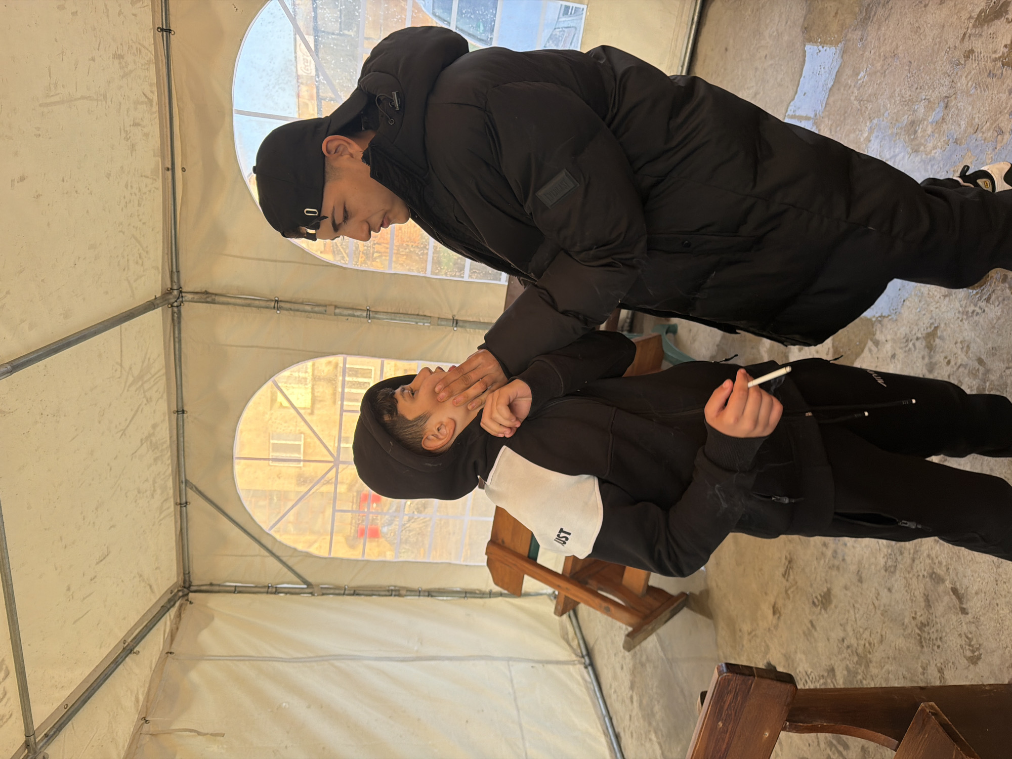 Two young males are inside a tent-like structure, possibly in Zlatna Panega, Bulgaria. One male, wearing a black hooded sweatshirt with a white panel, holds a lit cigarette in his right hand and has his left hand raised to his face. He appears to be sitting on a wooden bench. The second male, wearing a black winter coat and a black baseball cap, stands over the first male, and his right hand is on or near the first male's face. The interior of the tent is visible, revealing a metal frame and translucent fabric. Outside the tent, there is the vague image of a building. The floor inside the tent appears to be concrete.