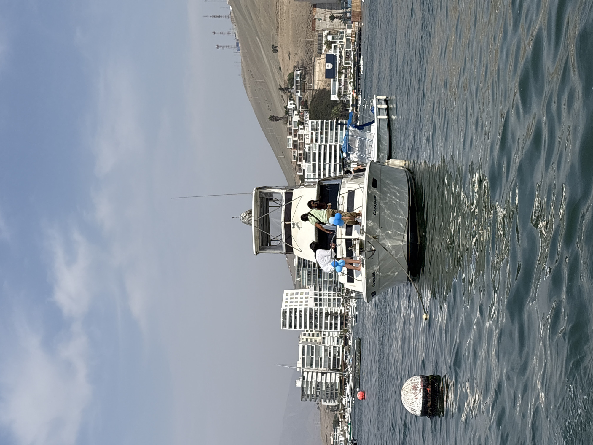 A daytime shot in Ancón, Peru, showcases a medium-sized white yacht with at least two individuals on its deck, positioned in a body of water