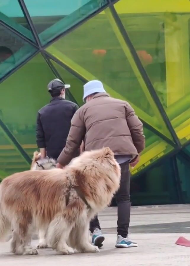 Two men are standing near a building with a geometric pattern of tinted glass. A large, fluffy dog is standing in front of the men. One of the men is wearing a blue bucket hat and a brown puffer jacket. The other man is wearing a black jacket and a baseball cap. There is another dog wearing sunglasses behind the other dog. The men are walking away from the camera. The ground is a gray, patterned surface.
