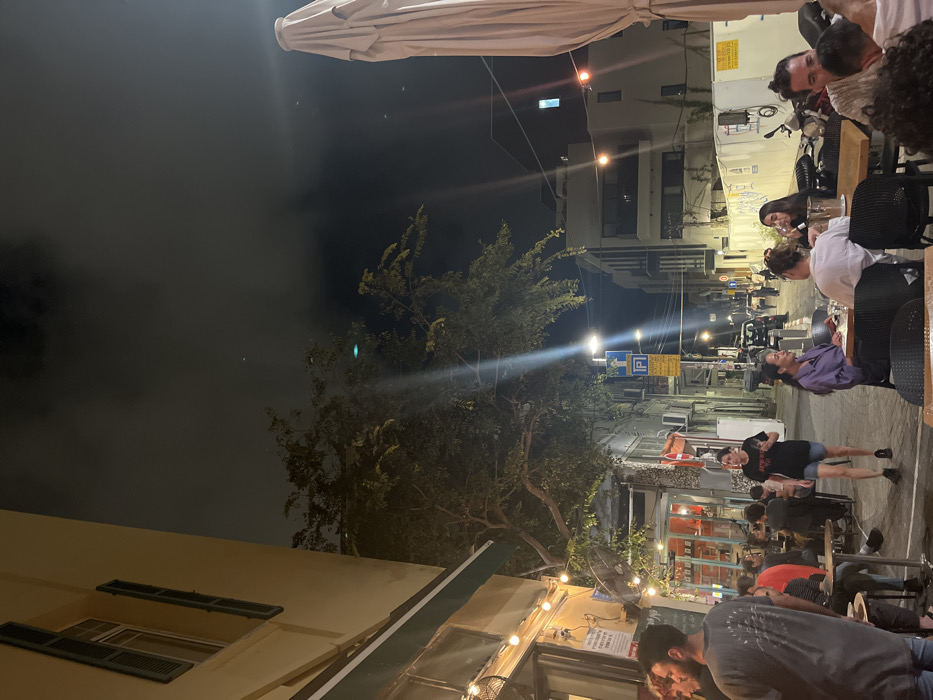 This image captures a commercial street at night in Tel Aviv, Israel. The scene is illuminated by streetlights, string lights, and light from establishments, against a dark, cloudy sky. On the left, a tall, light yellow building with two upper-story windows featuring closed green shutters is partially visible. Beneath it, string lights drape across an awning over an outdoor seating area. Multiple individuals are seated at round tables in this area, engaged in conversation. In the mid-ground, a large tree with dense foliage stands, heavily illuminated by a bright streetlight that causes a prominent lens flare. The narrow paved street extends into the background, where more multi-story buildings of varying architectural styles are visible, some darker and more modern. Several traffic and street signs are present, including a blue parking sign with a white "P" and a yellow sign featuring Hebrew text. Numerous people are depicted throughout the scene. In the foreground-left, a male with dark curly hair is seen from behind, wearing a dark t-shirt. Another male with a beard is beside him. A female in a dark t-shirt and shorts walks away from the viewer in the middle of the street. To the right, three females are seated at a wooden table, with one wearing a purple top and another a white top, engaged in conversation with drinks and a bottle of wine on the table. Another group of individuals is partially visible in the foreground-right, also seated. Other objects include a large, folded beige outdoor umbrella on the right, bicycles, and what appears to be a scooter or motorcycle parked further down the street. Air conditioning units are visible on building facades. The overall atmosphere suggests a lively evening gathering on a city street.