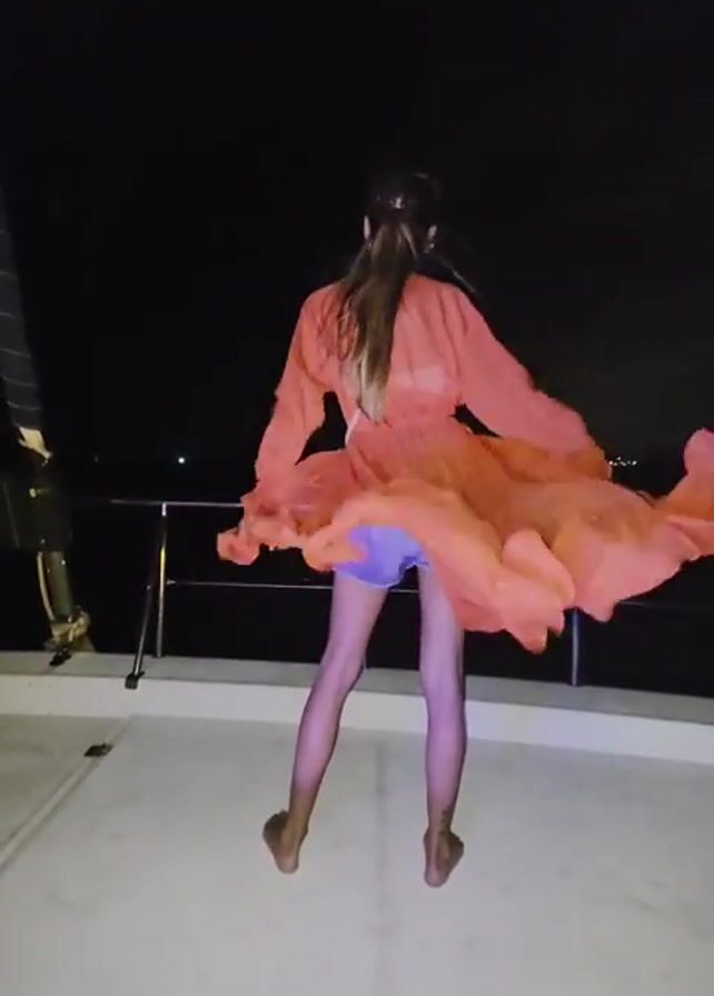 A young woman stands on the deck of a boat at night. The woman faces away from the camera and is wearing a long-sleeved orange wrap-around top and jean shorts. She has long brown hair pulled back in a ponytail. The woman stands barefoot on the white deck. The orange top billows in the wind. A silver metal railing is visible behind her. The sky is black.