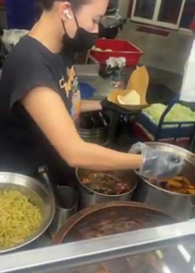 A woman wearing a black t-shirt, black face mask, and wireless earbuds is working at a food stall. She has her hair pulled back and is wearing clear plastic gloves. She is preparing food by picking up ingredients from different metal containers with tongs and placing them into a paper pouch containing what looks like sliced white bread. In front of her is a glass display case with a wooden steamer basket inside. To the left, there is a bowl of green shredded food. Behind her, there's a red basket with white cloths, a blue container, and the entrance to a building. The background noise contains the sound of a motorbike.