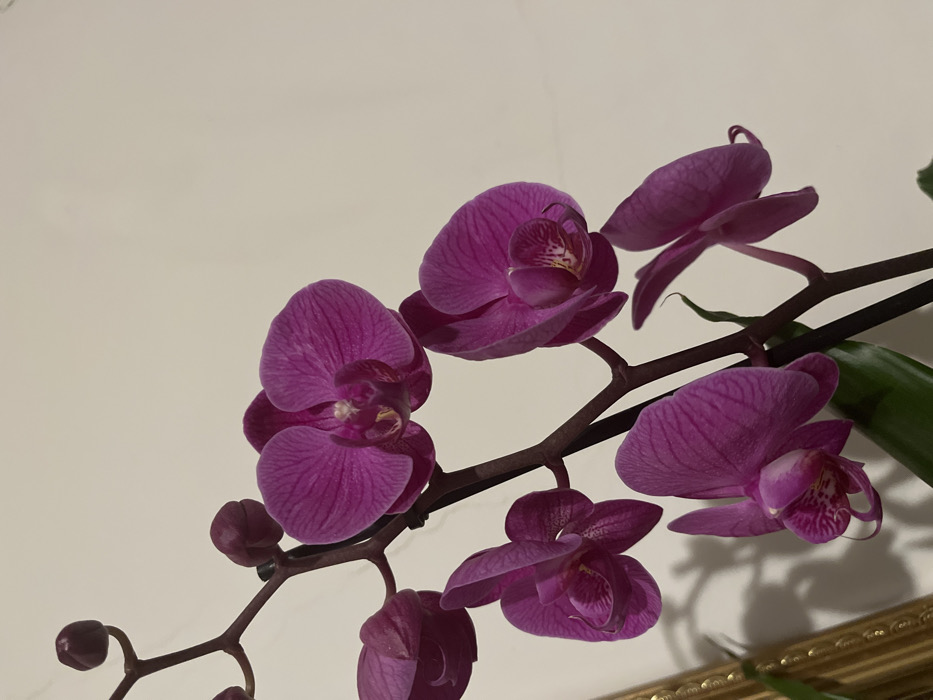The image displays a close-up of a Phalaenopsis orchid plant featuring multiple open magenta-purple flowers and several unopened buds. The flowers exhibit intricate veining and a lighter, speckled labellum at their center. Dark brown stems support the blooms. A portion of a green leaf is visible at the lower left. The background is a plain, light beige wall. In the bottom left corner, a section of an ornate, gilded frame is partially visible, casting a shadow onto the wall. The lighting appears to originate from an unseen source, creating distinct shadows behind the plant and the frame. The specific location within Plovdiv, Bulgaria, cannot be determined from the visual information provided.