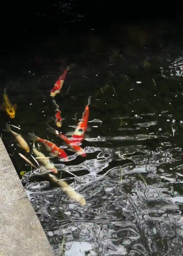 dark koi pond with several red, white, and gold koi fish swimming in it. The water is rippled, reflecting the sky. There's a concrete edge or ledge on the side of the pond. Some plant matter or debris is also visible in the water.