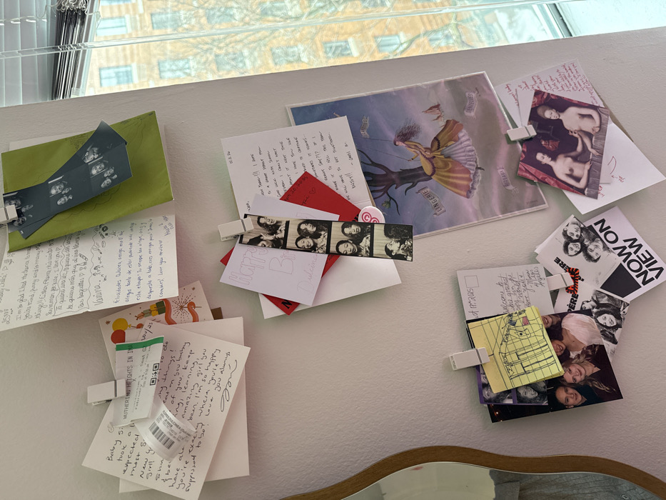 A collection of paper items is attached to a white wall. Among them are personal letters, greeting cards, a photo strip with images of young women, and printed materials. Some letters express heartfelt sentiments and congratulations, while others contain personal anecdotes. The cards feature festive designs and printed messages. Additional elements include magazine clippings and a doodle on yellow paper. The papers are held in place by white plastic clips.