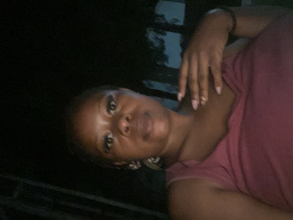 A woman poses with her head tilted, seemingly at night. She wears a dark bracelet and pink nail polish. Her shirt is maroon. Her features are visible, including her eyes and mouth. Dark surroundings suggest an outdoor setting, possibly with trees or structures silhouetted in the background.