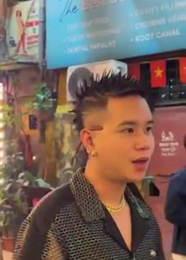 Here is a detailed description of the video: A young man with a unique hairstyle and attire stands on a busy street. His hair is styled in a spiky mohawk with a shaved undercut. He's wearing a black and grey patterned shirt and a gold chain necklace. He appears to be talking or listening to someone off-screen. The background is filled with the hustle and bustle of a city street. There are other people walking around, including a man with a bowl cut. Buildings line the street, with signs and decorations visible. A dental clinic sign is prominent, advertising services like checkups, teeth whitening, and root canals. The Vietnamese flag is also visible. Decorative lights add to the lively atmosphere.