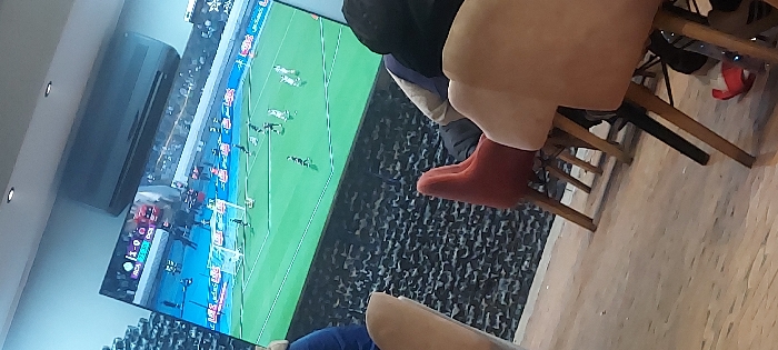 The scene depicts an interior view of a commercial establishment, likely a cafe or lounge, situated in Dkhissa, Morocco. A large flat-screen television, mounted on a light-colored wall, displays a live football match with a scoreline of "RCA 1-0 DCL" visible on the upper left. The screen shows players in white and dark kits on a green pitch, with blurred stadium stands in the background. Above the television, a white wall-mounted air conditioning unit is installed. The ceiling is light-colored and features two visible recessed spotlights. The wall below the television is covered with dark, textured, patterned tiles. The floor consists of light-toned wooden planks. In the foreground and midground, several individuals are seated in chairs, oriented towards the television. A person is seated in a reddish-brown upholstered chair with light wooden legs, viewed from the rear, with their upper back and a dark-sleeved arm partially visible. To the immediate right, another person is seated in a light beige upholstered chair, with their lower leg and a foot clad in a red slipper visible. A blue garment and the partial outline of another chair are present on the far left. The collective action involves the seated individuals observing the football broadcast.