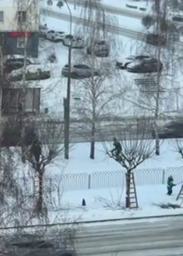 The scene is a stationary, long shot taken from an elevated perspective, likely a window, overlooking a snowy urban landscape. A road divides the foreground from the background, with cars driving on the partially snow-covered asphalt. Snow covers the ground and vehicles. In the foreground, three small trees are pruned. Three individuals, dressed in dark clothing, are seen pruning the trees, each positioned on or beside a ladder. The individual on the leftmost tree is perched in the tree. A ladder leans against the middle tree, where a second individual is actively trimming the branches. A third individual stands near the tree on the right. In the background, several cars are parked along the street, with a few driving by. Buildings and lampposts are visible on the other side of the road, adding to the urban setting. The overall mood is cold and still, reflective of a winter day.