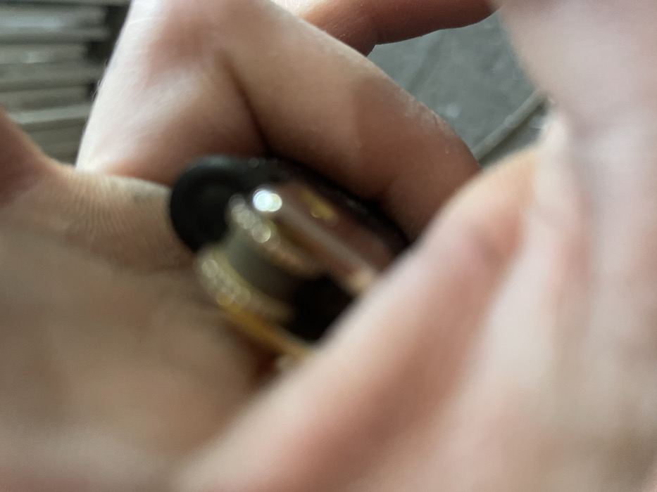 The image presents an extreme close-up of a human hand grasping an elongated, dark-colored object. The object exhibits a reflective surface with visible light reflections and features a distinct golden or brass-colored band. The hand's fingers are visible, partially obscuring the object. The background is severely out of focus, showing indistinct blurry vertical lines and shapes, consistent with an indoor environment. No other individuals or specific actions are discernible. Due to the extreme close-up and blurriness, the image provides no discernible information regarding its specific geographical location, including any city or region such as Tbilisi, Georgia.