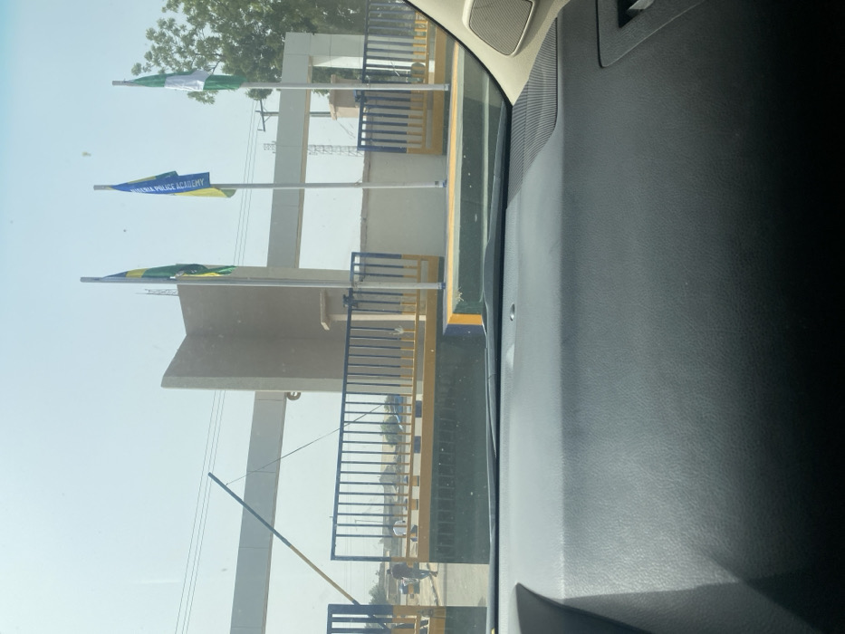 The image depicts the entrance gate of the Nigeria Police Academy in Yan Dala, Nigeria, viewed from the interior of a vehicle through its windshield