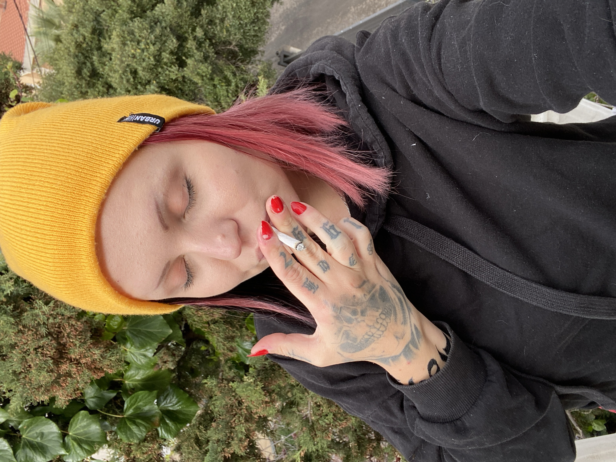 This image depicts an individual outdoors in the city of Kunje, Montenegro. The subject is a presumed female, positioned from the chest up, with eyes closed. She wears a yellow ribbed knit beanie with a black "URBAN" tag and a black hooded sweatshirt. Her left hand, adorned with extensive tattoos including a prominent skull design on the back and various symbols on the fingers, holds a lit cigarette to her lips. The fingernails of this hand are painted red, and a ring with a clear stone is visible on the middle finger. The background consists of dense green foliage, including broad leaves and coniferous-type trees. A reddish-brown tiled roof and additional distant greenery are partially visible on the right, suggesting an elevated outdoor position, possibly on a balcony, with a white railing present in the lower left foreground.