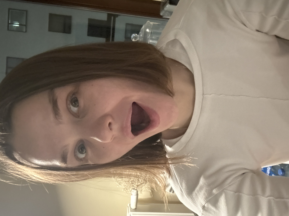 A woman with short, brown hair and fair skin looks into the camera with her mouth wide open. She wears a white, long-sleeved shirt. Behind her is a window reflecting a building at night. A clear container is visible on a shelf behind her. The lower part of a white shelf and the top of a blue water bottle can also be seen.
