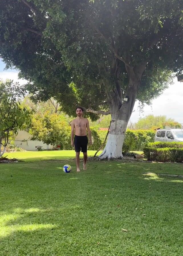 - "A shirtless man is standing on a green lawn and kicking a volleyball" by FM-thekB3, licensed under CC BY 4.0