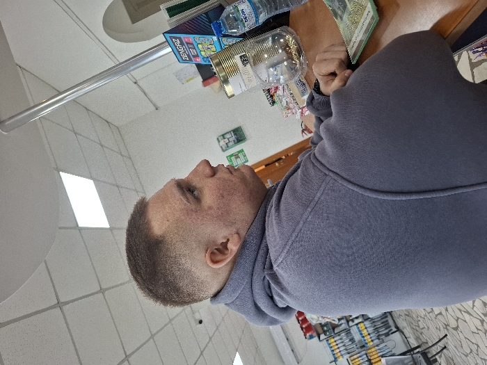 The scene is set indoors within a retail establishment or service office in Bogomilovo, Bulgaria. A young adult male is positioned in profile, facing right, with his right arm resting on a light brown wooden counter. He has short, faded dark hair and wears a plain grey hooded sweatshirt. His gaze is directed forward and slightly upward. On the wooden counter, a stack of green paper currency is visible beneath his right arm. To his right, a clear plastic bottle of Devin brand water with a blue cap stands next to a large, transparent cylindrical container filled with numerous small, shiny, metallic objects. Behind these items, promotional posters or flyers are displayed, one clearly labeled "ZENGRAZ." The background features white walls and a white suspended ceiling composed of square acoustic tiles with integrated rectangular fluorescent light panels. A silver-colored pole extends vertically from floor to ceiling to the right of the counter. Further right, an arched doorway is partially visible. On the wall behind the man, several green and white signs are affixed. To the far left, shelves displaying various items, including yellow and black cylindrical objects, are present. The floor, partially visible, exhibits a patterned tile design.
