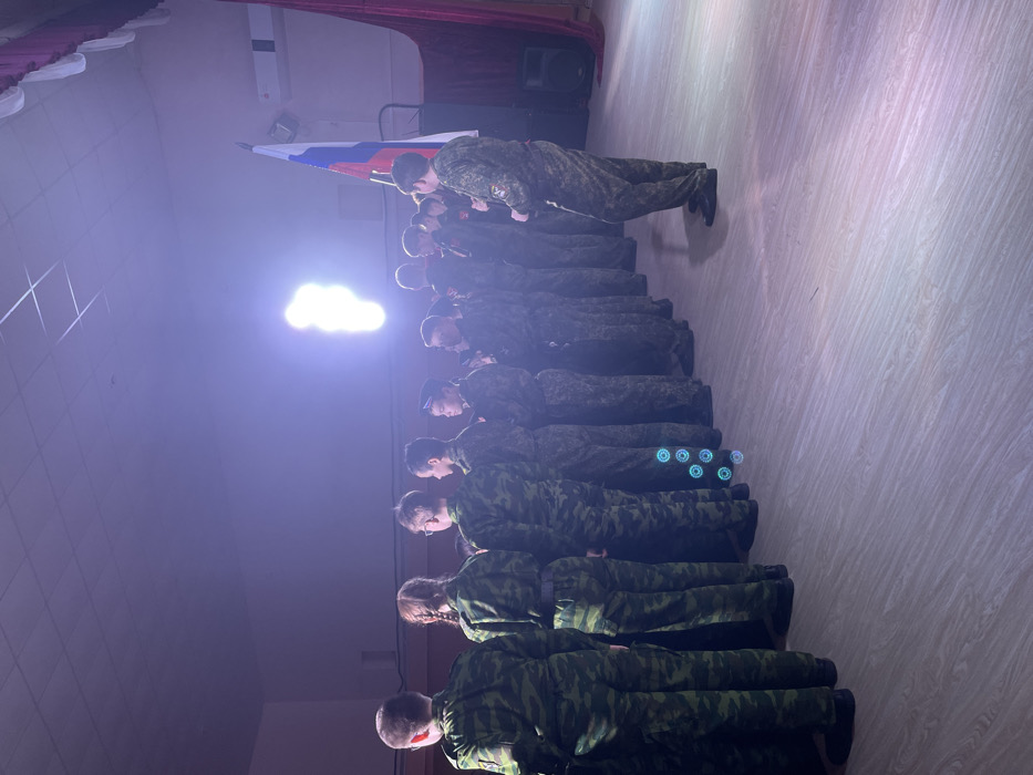 The image displays an indoor scene in Sarapul, Russia, depicting a line of approximately 15 individuals, predominantly youth, standing in formation. They are viewed from behind, facing an unseen area, possibly a stage or front of a hall. All individuals wear camouflage pattern uniforms; several wear dark peaked caps. Two females with braided hair are visible in the line. To the far right of the frame, a Russian tricolor flag is positioned vertically on a pole. Adjacent to the flag is a dark speaker unit. Dark red curtains are partially visible along the right edge, suggesting a stage or backdrop. The area is illuminated by a strong, vertical light source positioned on the mid-right, casting a bright glow, and supplemented by general overhead lighting. The floor is composed of light-colored wood laminate, and the ceiling is light-colored with visible grid patterns. Faint blue circular patterns appear on the lower uniforms of some individuals, indicative of light reflections or artifacts. The overall scene suggests a formal event or ceremony.