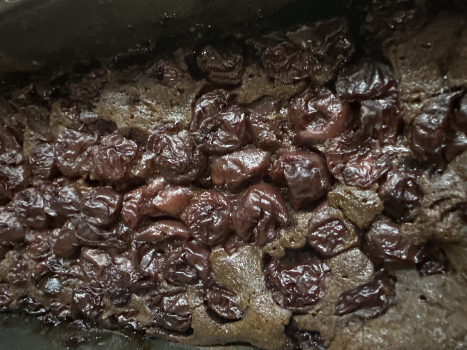 A close-up shot reveals a baked dessert, seemingly a cherry or plum clafoutis. The dark red fruits are tightly packed on top of a darker, possibly chocolate-flavored batter. The fruit appears glossy, indicating some level of caramelization or the presence of a syrup. The texture is slightly rough and wrinkled, suggesting the baking process has concentrated the fruit's sugars and juices. The dessert is contained within a dark, possibly metallic baking pan.
