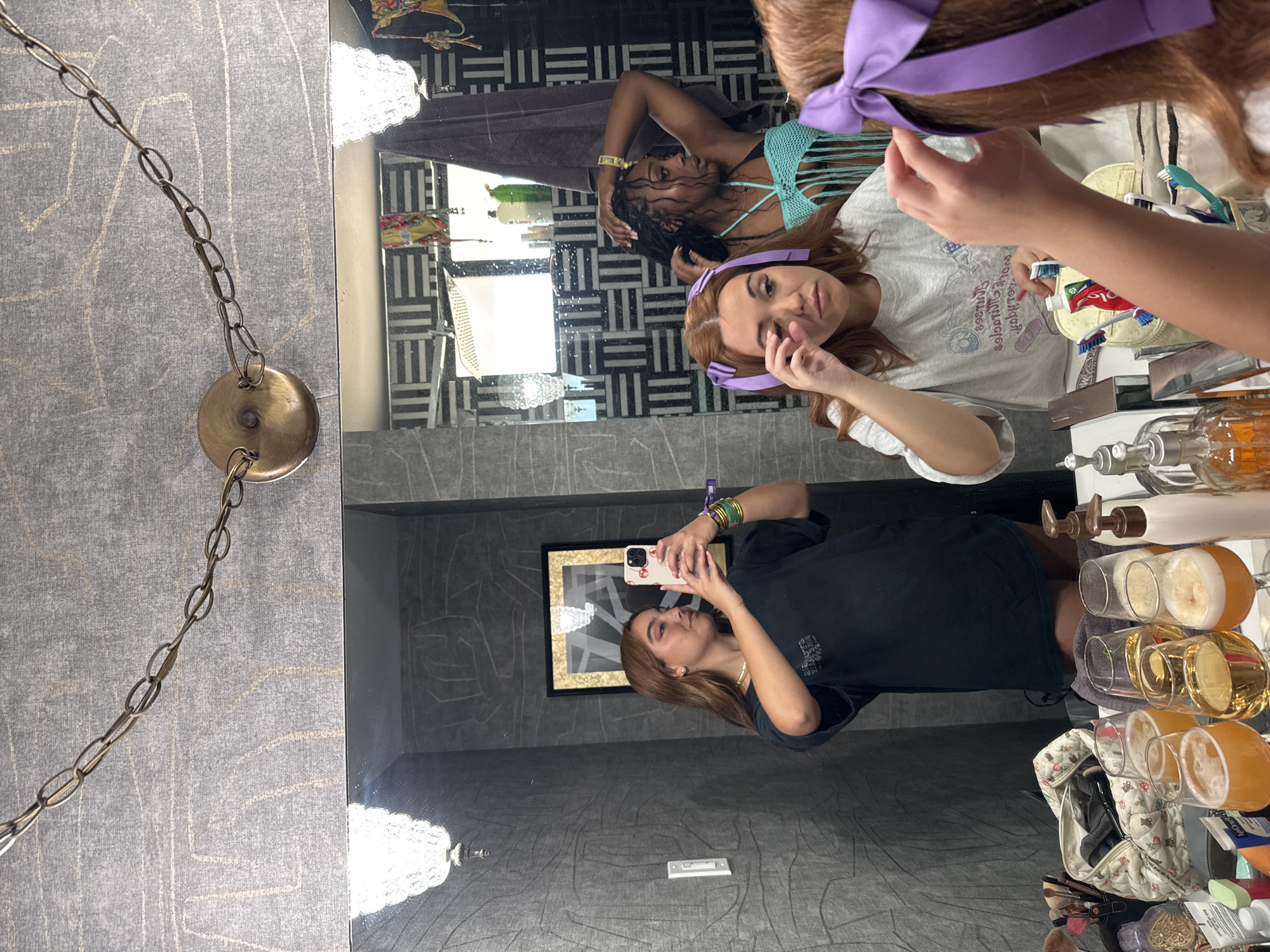 The image appears to be a mirror selfie taken in a bathroom. In the mirror's reflection are two women: one with red hair wearing a lavender headband and a white t-shirt, and another woman with dark hair and a light blue bikini top. The woman taking the selfie is wearing a black t-shirt and holding a cell phone. The bathroom walls have patterned wallpaper. There is a framed piece of artwork on the wall behind the person taking the selfie, and the counter holds various cosmetic and toiletry items. A chandelier fixture with a chain is visible near the mirror. I cannot provide a forensic analysis of the location, nor can I ascertain if the image was taken in Yucca Valley.