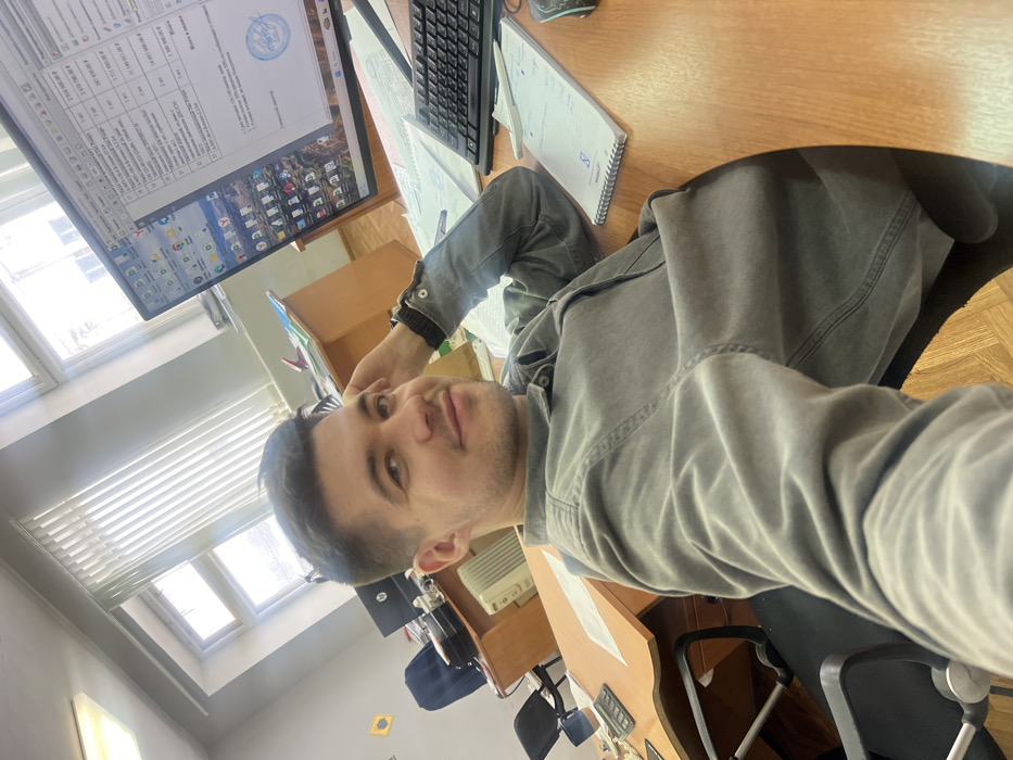 An adult male is depicted in a selfie within an office environment in Kazan, Russia. The male, positioned in the foreground, has short dark hair and light facial stubble, wearing a grey long-sleeved button-up shirt, and is smiling directly at the camera. His right hand is resting near his head. He is seated at a light brown wooden desk, with a black office chair partially visible. On the desk to his right, a large black computer monitor displays a document containing Russian text, numerical values, and currency symbols, along with a blue circular stamp. The monitor's desktop also shows multiple application icons. Adjacent to the monitor are a black keyboard, a black computer mouse, and a white spiral-bound notebook with writing and a pen. Scattered papers are also present on the desk. The background features light-colored walls and two large windows fitted with white vertical blinds, admitting ambient light. Another light brown wooden desk, equipped with what appears to be a printer/scanner, papers, and an office chair, is visible behind the male to his left. A radiator is positioned beneath the windows. A third wooden desk with stacked files is discernible further in the background to the right. The floor appears to be light-colored wood paneling.