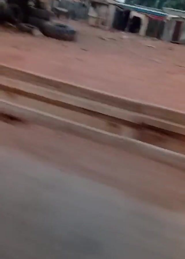 moving perspective from what appears to be a vehicle traveling along a road. On the roadside, there's a mixture of developed and undeveloped land. There are structures that look like shops or simple buildings, along with areas of red dirt and some roadside barriers. Vehicles like trucks and what might be a tanker can be seen in the background, along with some sparse vegetation. The overall environment looks somewhat urban but with a rough or unfinished feel. The sky is overcast.
