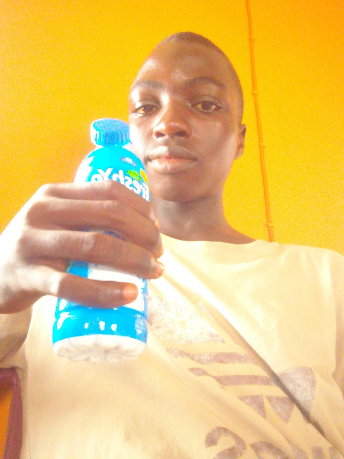 A young male individual with dark skin and a short haircut is shown in a medium-close-up, looking directly into the camera. He is wearing a light-colored, possibly beige or light yellow, short-sleeved t-shirt with a faded graphic visible on the chest. His right hand is extended forward, holding a light blue plastic bottle with a matching screw cap. The bottle features a label with white and blue elements, displaying the reversed brand name "FRESGO" on the front. The background consists of a brightly lit, solid yellow wall, indicating an indoor setting. Location is in the city of Unknown, Unknown.