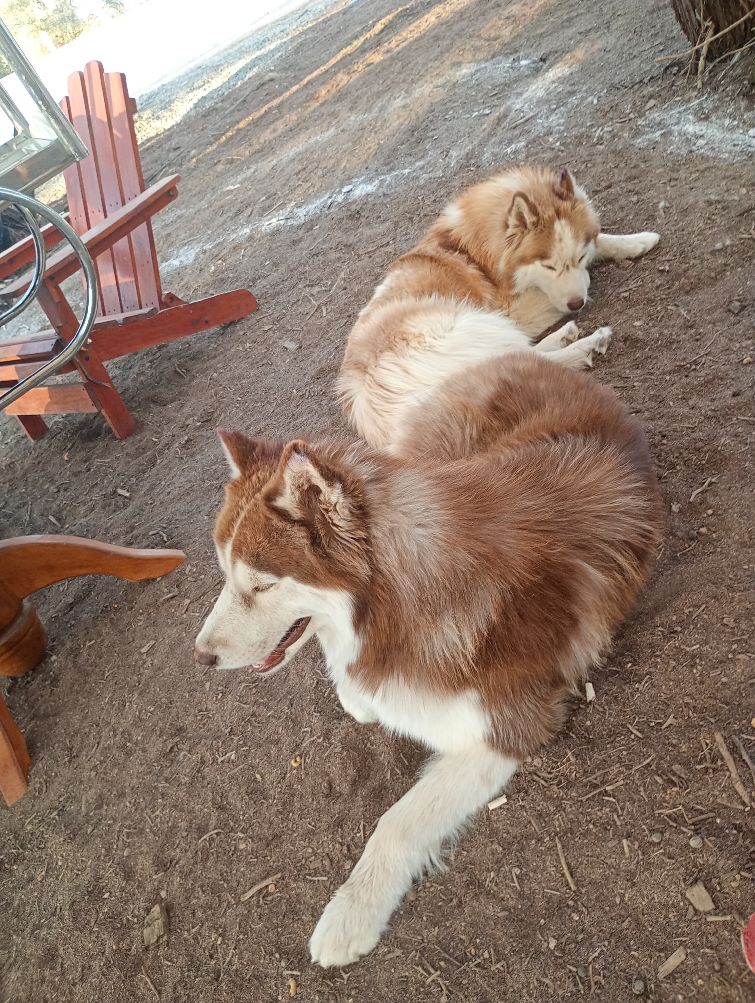 Two Siberian Huskies are lying on the ground. The husky closest to the viewer is looking to the left of the frame, and the other is sleeping. They are both light brown and white. The ground is dirt. In the background is an outdoor chair and a table, implying the scene is outdoors, perhaps a yard. This could be located in Pozo Almonte, Chile.
