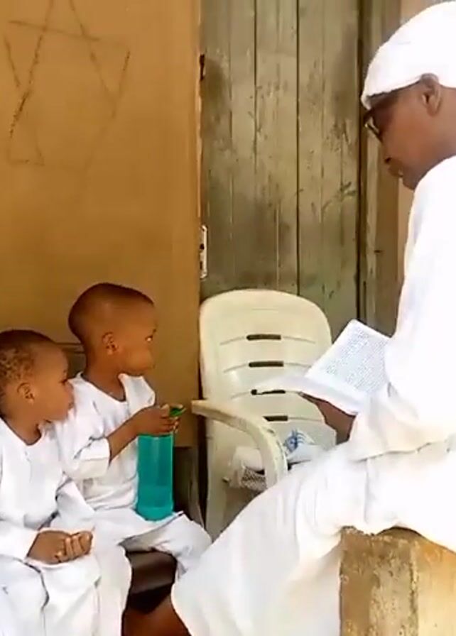 An adult man in a white outfit, including a white head covering, is sitting on an exterior wall and reading from a book to five children who are all wearing white outfits, including white head coverings for the girls. They are sitting on a bench in front of a building, watching the man read. A blue water bottle is in the hands of one of the children. A plastic chair is between the man and the children. A Star of David symbol is drawn on the wall of the building. A sixth child is visible in the background.