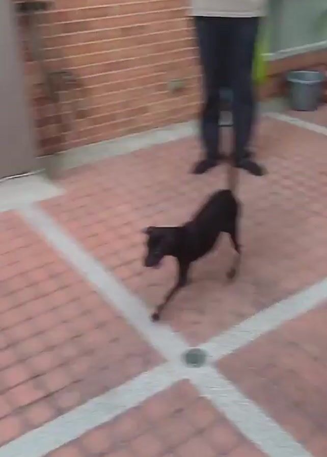 A dog plays with a red ball in a brick courtyard. The dog is small, black, and has a white spot on its chest. Three people are standing around the dog, seemingly watching it play. The person closest to the camera kicks the ball, then another man kicks it. The man in the beige shirt holds his phone as the dog sniffs and circles around the ball. The brick courtyard is surrounded by a brick wall and has a door. There is a potted plant and a folding chair nearby.