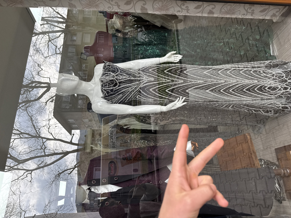 The image captures a storefront window in Asenovgrad, Bulgaria, displaying formal attire. A light-skinned human hand, with the index and middle fingers extended in a 'V' gesture, is prominent in the lower-left foreground, positioned against the exterior of the glass. The central subject inside the window is a headless white mannequin wearing a strapless, floor-length evening gown. The gown is dark-toned, intricately embellished with silver sequins and beads forming a distinct chevron pattern on the skirt and elaborate decorative scrollwork on the corset-style bodice. To the left of this, another display features a men's formal suit comprising a maroon jacket, a white collared shirt, and a dark tie. Additional formal garments, including a sequined emerald green dress, are visible deeper within the store's interior. The window's surface reflects an outdoor urban environment under an overcast sky. Prominent reflections include the bare branches of a deciduous tree and a multi-story building with numerous windows and balconies. A partial reflection of a commercial sign, containing the words "Hora" and "BEER NUTS," is discernible on the left side of the reflective surface.