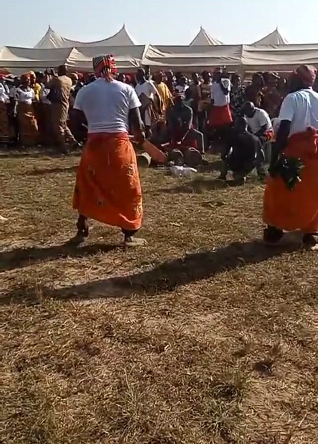 Two men wearing white t-shirts, orange patterned skirts, and patterned headbands, are dancing in a field. In the center of the field are a few people sitting and kneeling on the ground. A crowd of people stand under white tents in the background. The field is dry with brown grass. It is daytime.