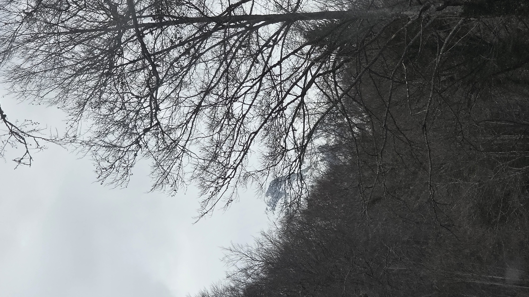 The image depicts an overcast winter or late autumn mountainous landscape in the vicinity of Рилски манастир, Bulgaria. The foreground and midground are dominated by a dense, leafless deciduous forest, with dark, intricate tree branches silhouetted against a lighter sky. A prominent tree trunk is visible on the far right. In the background, partially obscured by the barren trees and atmospheric haze, a snow-capped mountain peak with visible rock formations rises under a uniformly gray, overcast sky. No people, animals, or artificial structures are present. The scene is static, devoid of discernible actions or interactions.