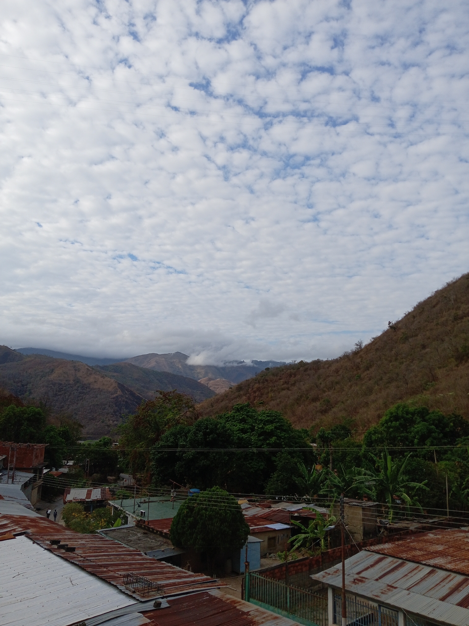 The image depicts an elevated view of Las Tejerías, Venezuela, taken after a disaster. Corrugated metal rooftops, many rusty and damaged, dominate the foreground. Trees and vegetation are visible between the buildings. In the background, mountains rise, some shrouded in clouds. The sky is filled with puffy clouds. The scene shows clear evidence of damage and destruction. Two people can be seen walking down a street in the mid-ground. The environment suggests a tropical or subtropical location affected by a major event.