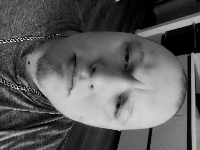 A close-up, black and white indoor photograph depicts a single male individual, presented from the chest up