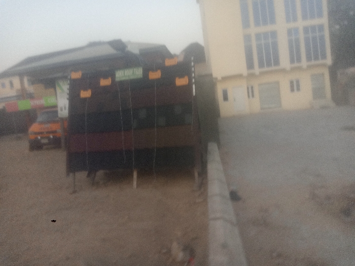 A display rack of "Apex Roof Tiles" stands in front of a single-story building with a sign on its side