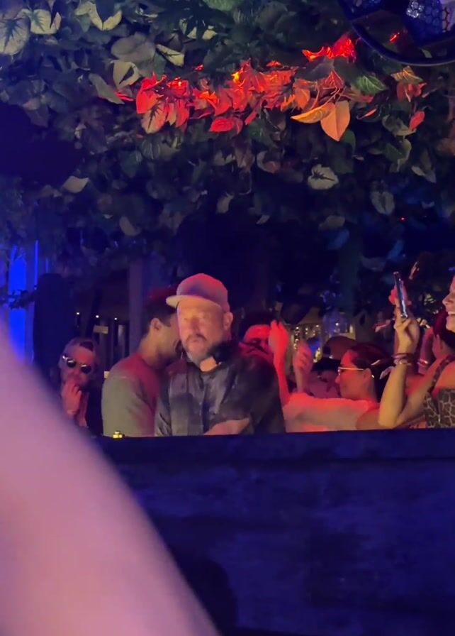 DJ booth at a nightclub, with a DJ in a grey hat and patterned shirt visible behind the booth. People are in front of the booth, some of whom are holding up their phones to record. The environment is decorated with artificial plants and colorful lights, giving it a party atmosphere. A man with sunglasses can be seen on the left. The camera seems to be at the level of the dance floor, capturing the scene from the perspective of someone in the crowd.