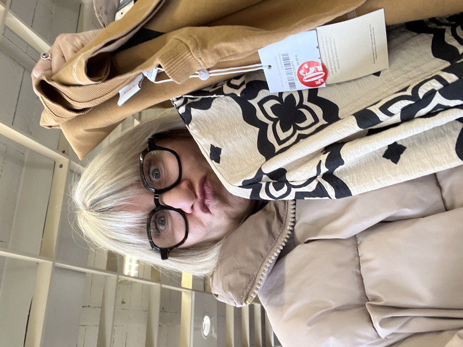 An adult female, possessing light blonde hair with bangs and wearing dark-rimmed, octagonal eyeglasses, is depicted in a close-up, self-portrait style within an interior retail clothing store in Andrézieux-Bouthéon, France
