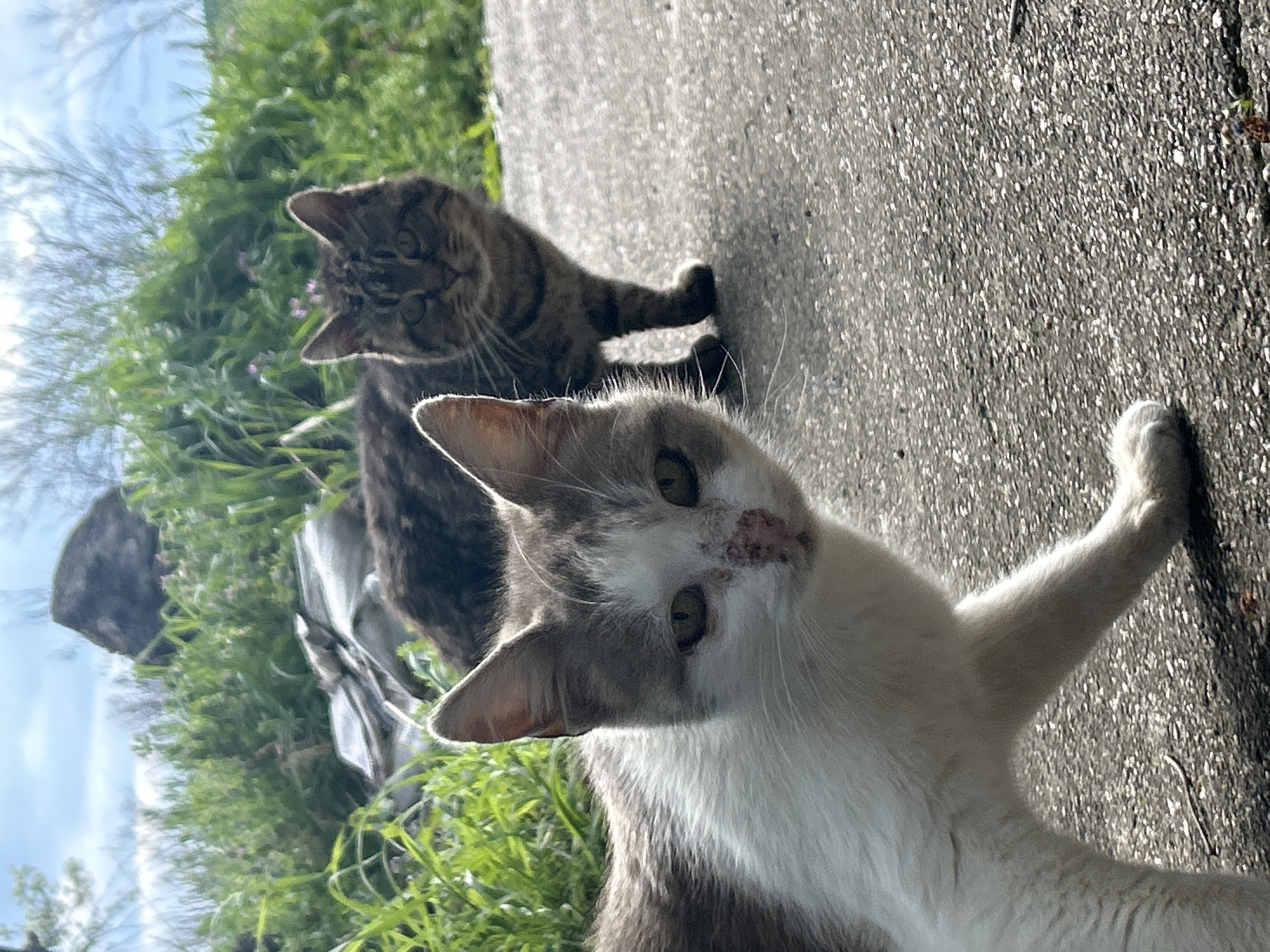 Two cats are on a concrete surface. One cat, in the foreground, is white and grey, has green eyes, and an injury above its right eye. The second cat, in the background, is a tabby cat with dark stripes. Grass and other plants are visible along the side of the concrete surface. The location is Briastovo, Bulgaria.