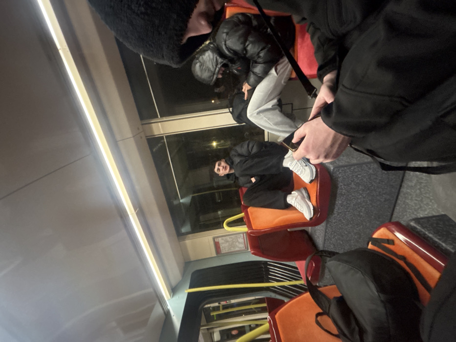 Inside a train carriage, passengers occupy orange and red seats. A young man in a black jacket and black trousers sits with his feet up, wearing white sneakers. Another person, also in a dark jacket, sits behind him in grey sweatpants. A third person wearing a black beanie leans into the frame, partially obscuring the view. The window reveals a night scene with distant lights.