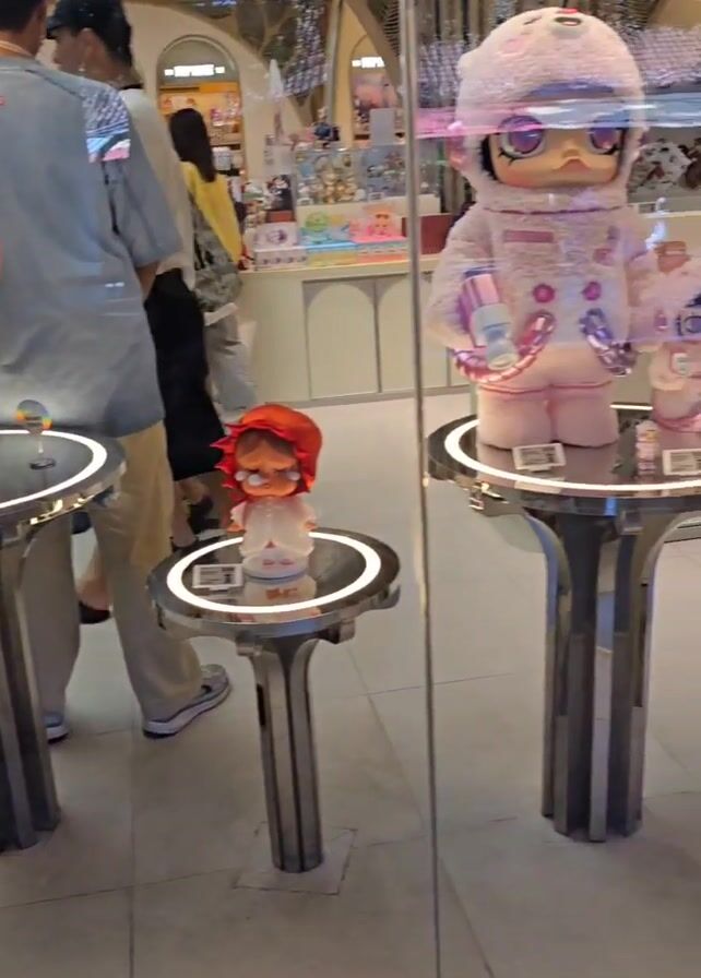 display of collectible dolls inside a store behind a glass partition. The dolls are arranged on shiny, modern-looking tables with lights around the edges. There are four tables visible, each with one or two dolls on display. The dolls are diverse in appearance: one resembles Little Red Riding Hood, others have astronaut suits, and one is dressed like a character from the Squid Game television series. People are walking around in the store, browsing the displays. The store has a modern, upscale design with white walls and light wood accents.